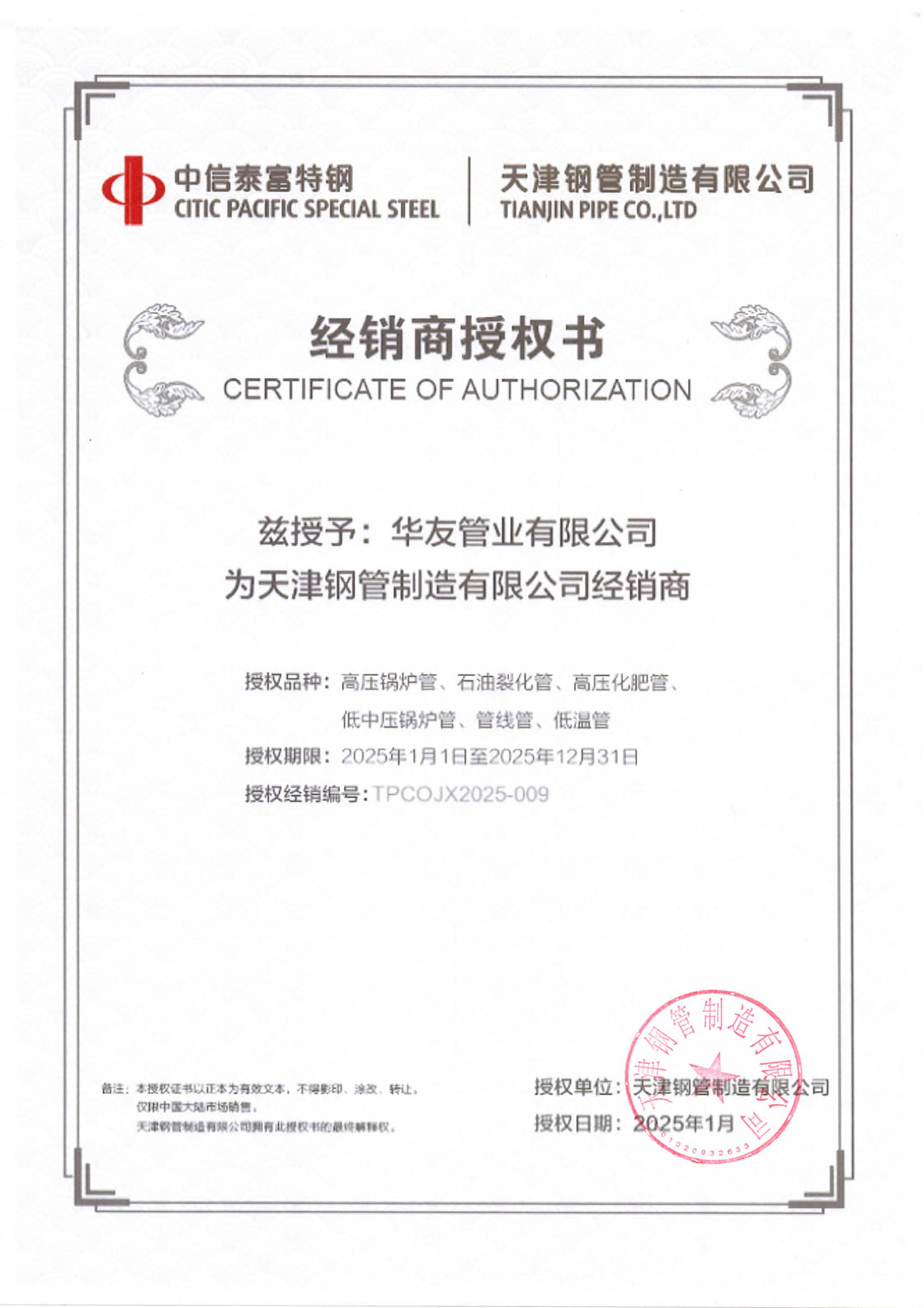天津鋼管經(jīng)銷商授權(quán)書